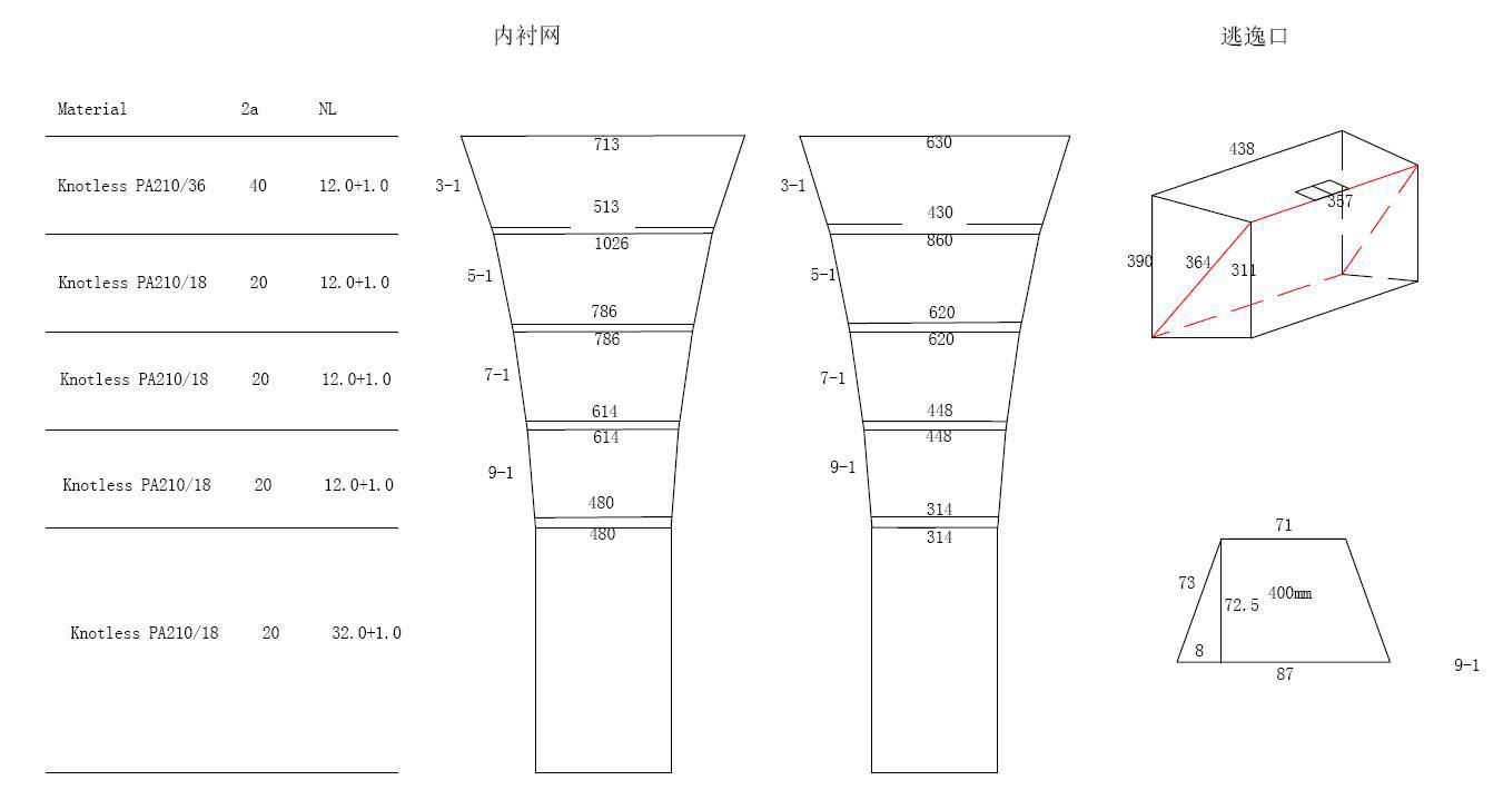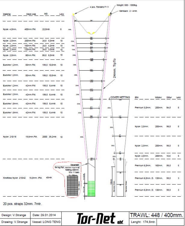 Midwater Otter Trawl Net-mouth height: 20m Net-mouth width: 40m Total net length: 132m Codend-mouth height: 1.8m Codend-mouth width: 1.8m Codend length: 24m Codend mesh size: 16mm Mammal exclusion device type: Oblique panel in net leading to escape window Mammal exclusion device diagram: Gear diagram: |