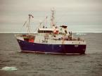 Vessel marked with name and international radio call sign. Blue hull and white super structure.