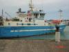 Registration number, call sign, name, homeport, IMO number. Blue hull. White upper deck.