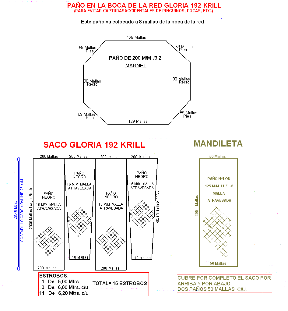 Midwater Otter Trawl Net-mouth height: 16m Net-mouth width: 32m Total net length: 106.8m Codend-mouth height: 3.4m Codend-mouth width: 3.4m Codend length: 26m Codend mesh size: 13mm Mammal exclusion device type: Large mesh panel across mouth/first section of net Mammal exclusion device diagram: Gear diagram: |