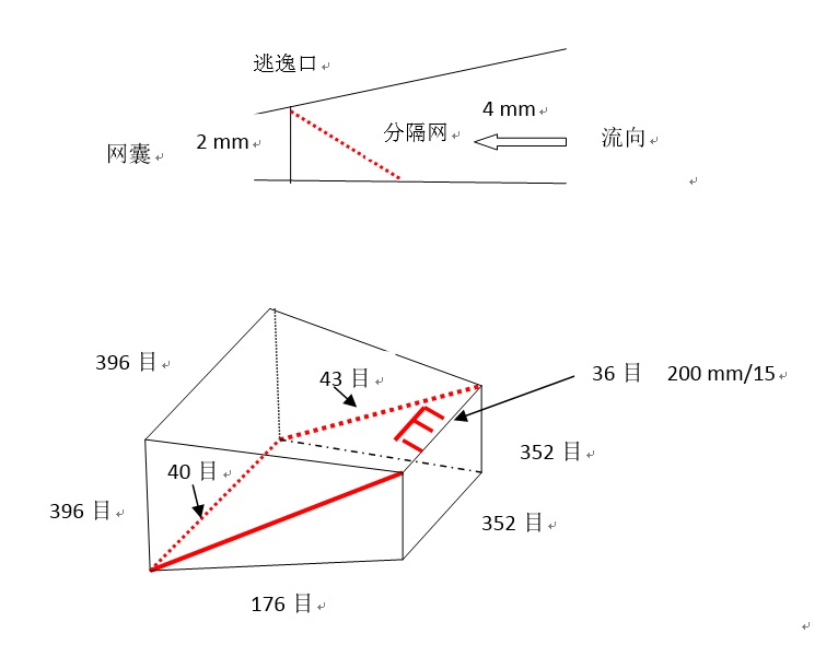 Midwater Otter Trawl Net-mouth height: 25m Net-mouth width: 27m Total net length: 176m Codend-mouth height: 2.8m Codend-mouth width: 2.8m Codend length: 42m Codend mesh size: 20mm Mammal exclusion device type: Oblique panel in net leading to escape window Mammal exclusion device diagram: Gear diagram: |