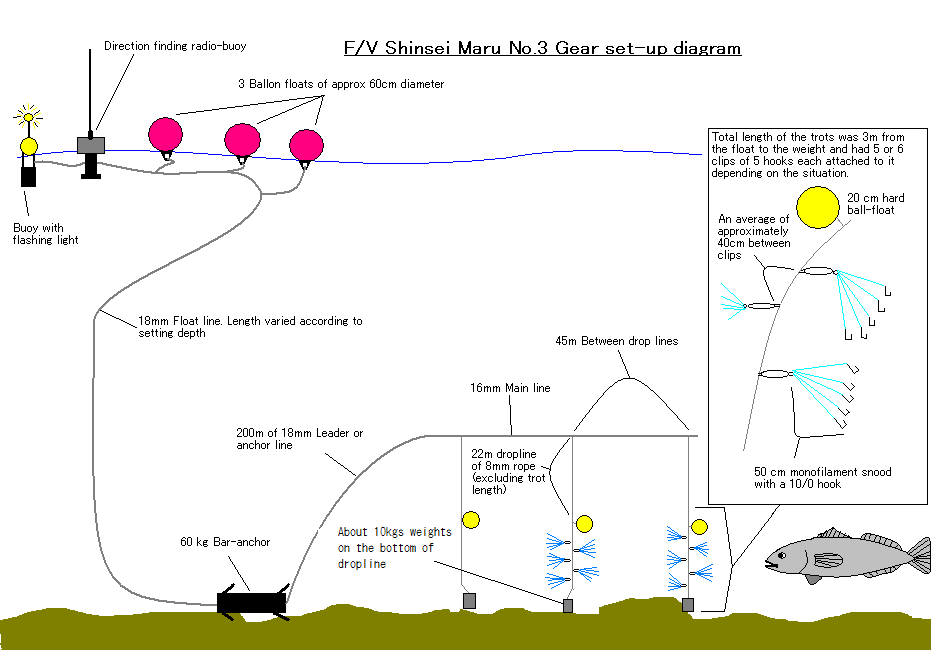 Trotline Longline weights: Yes Longline Weight material: Steel + Concrete Minimum mass of longline weights: 10kg Maximum spacing between longline weights: 45m Number of hooks per cluster: 5 Spacing between cluster hooks: 0.5m Spacing between drop lines: 45m Number of clusters on a dropline: 5 Gear diagram: |
