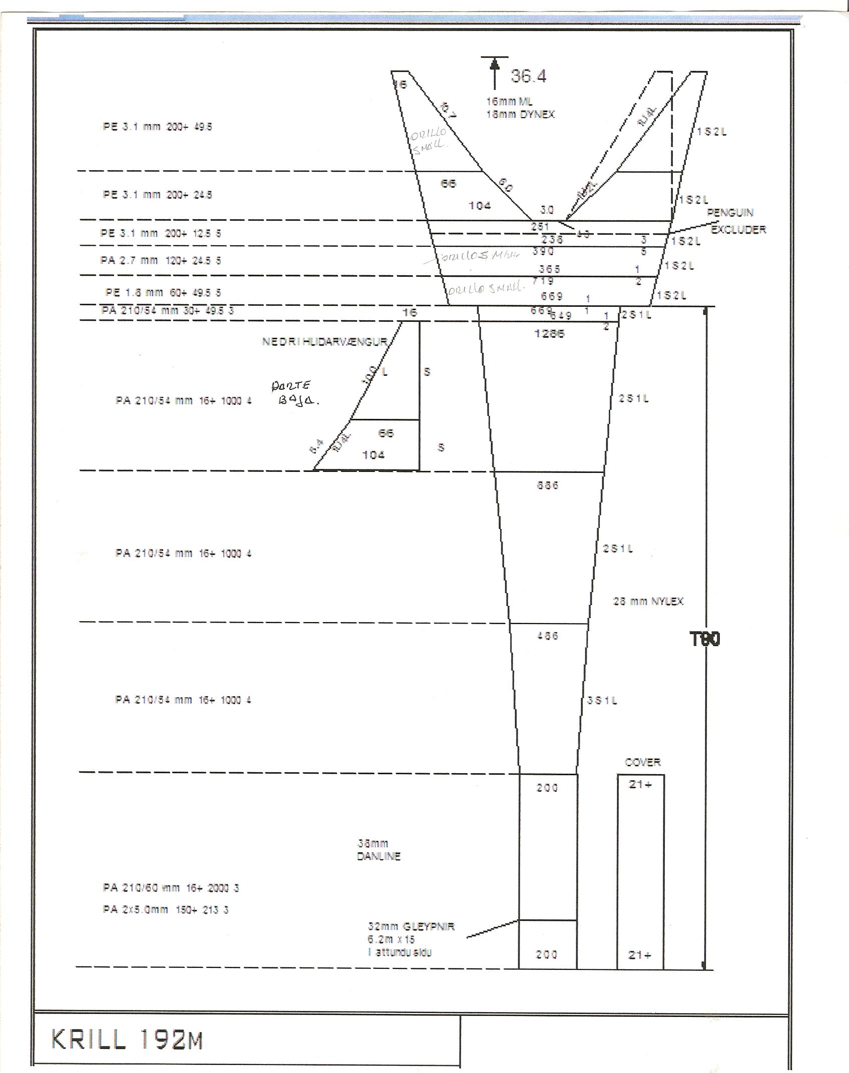 Midwater Otter Trawl Net-mouth height: 16m Net-mouth width: 32m Total net length: 106.8m Codend-mouth height: 3.4m Codend-mouth width: 3.4m Codend length: 26m Codend mesh size: 13mm Mammal exclusion device type: Large mesh panel across mouth/first section of net Mammal exclusion device diagram: Gear diagram: |