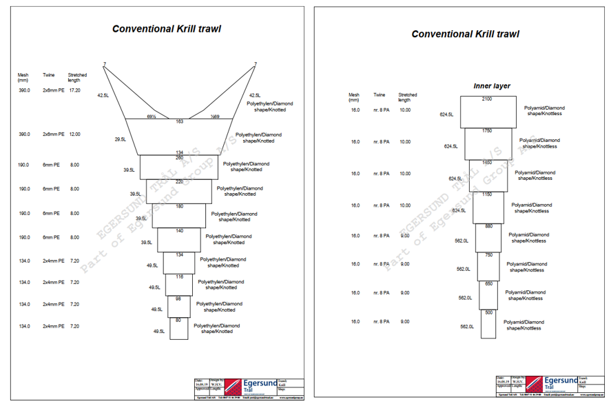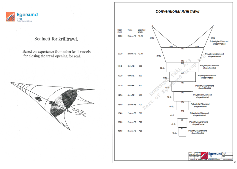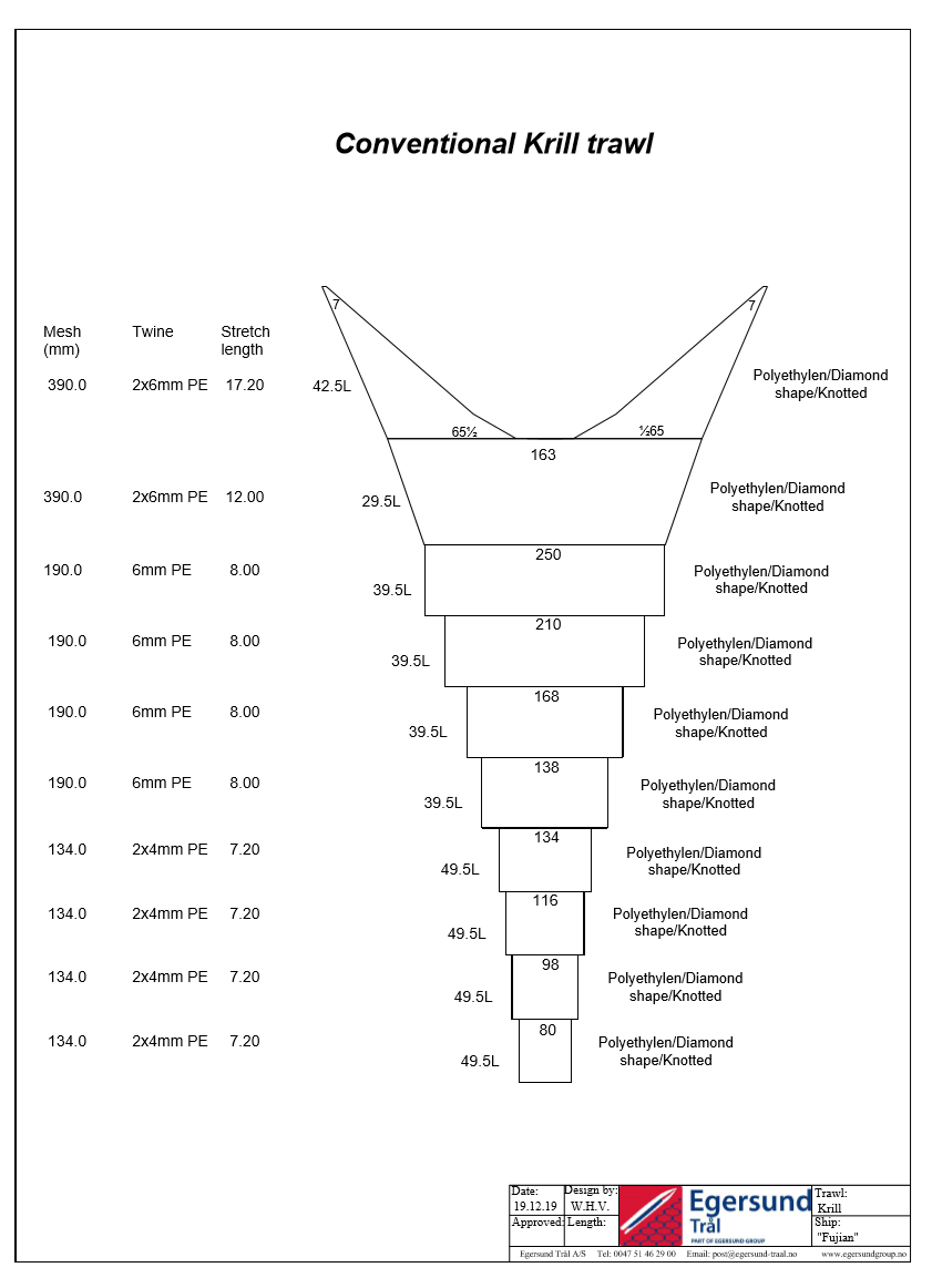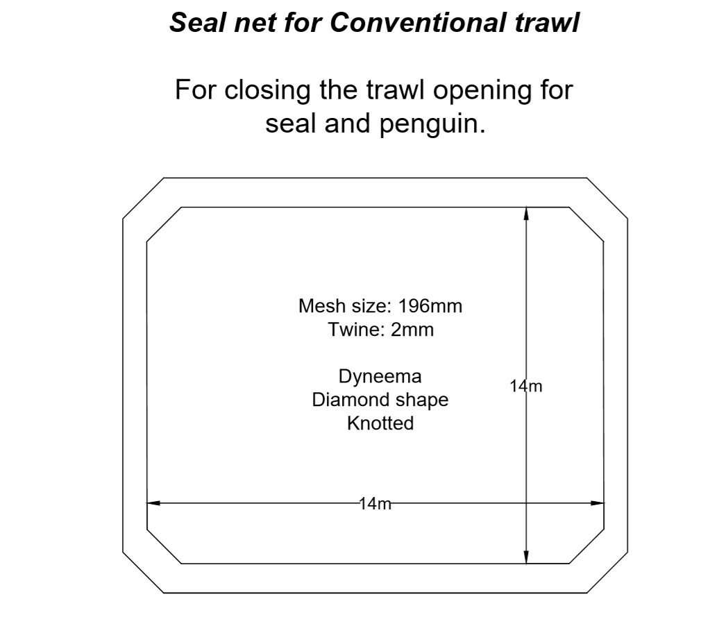 Midwater Otter Trawl Net-mouth height: 20m Net-mouth width: 21m Total net length: 138m Codend-mouth height: 2.8m Codend-mouth width: 2.8m Codend length: 42m Codend mesh size: 20mm Mammal exclusion device type: Oblique panel in net leading to escape window Mammal exclusion device diagram: Gear diagram: |