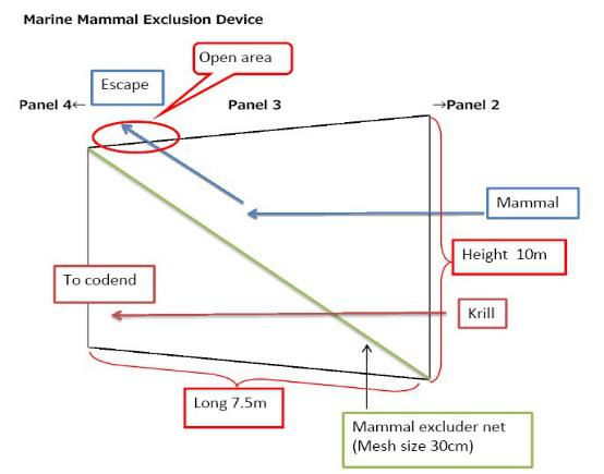 Midwater Otter Trawl Net-mouth height: 30m Net-mouth width: 30m Total net length: 128.5m Codend-mouth height: 3.8m Codend-mouth width: 7.6m Codend length: 31m Codend mesh size: 15mm Mammal exclusion device type: Oblique panel in net leading to escape window Mammal exclusion device diagram: Gear diagram: |