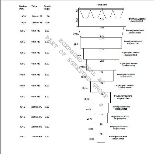 Midwater Beam Trawl Net-mouth height: 18m Net-mouth width: 20m Total net length: 152m Codend-mouth height: 2.5m Codend-mouth width: 2.5m Codend length: 29m Codend mesh size: 16mm Mammal exclusion device type: Large mesh panel across mouth/first section of net Mammal exclusion device diagram: Gear diagram: |
