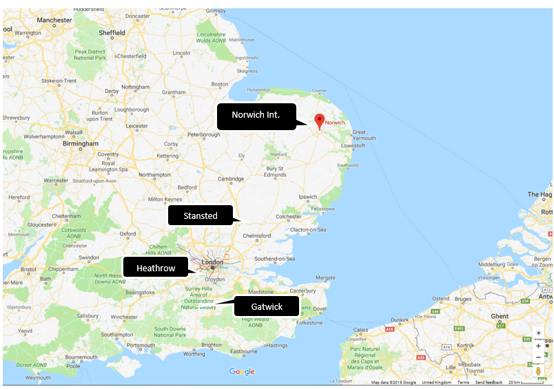 Norwich has an international airport, which serves connections to Amsterdam (NED). There are no direct flights between London airports and Norwich airport. If you’re flying long-distance, I would suggest checking if connecting through Amsterdam to Norwich is an option.