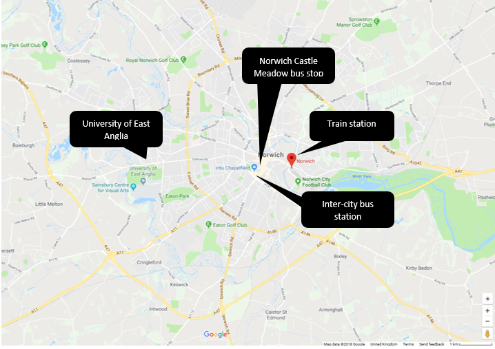 The connection between the university and city centre is frequent with buses going every 10–15 minutes until the late evening. Norwich also has the Ofo bike scheme, a rent scheme for bicycles through a mobile app (https://www.ofo.com/uk/en/), and the cycle direction to UEA is fairly straight forward. Norwich city centre is filled with restaurants, tea rooms, coffee roasters, pubs, and small local breweries, as well as a large covered market (which has been going in the same place for 900 years), small independent shops, many quirky little lanes, and historic sites. The easiest would be booking a hotel within walking distance to the castle (52.6287° N, 1.2964° E) or the train station (which is less central), from where several bus lines go to UEA. Details on bus lines can be found here: https://portal.uea.ac.uk/documents/6207125/6385406/Buses+to+UEA+May+2016....